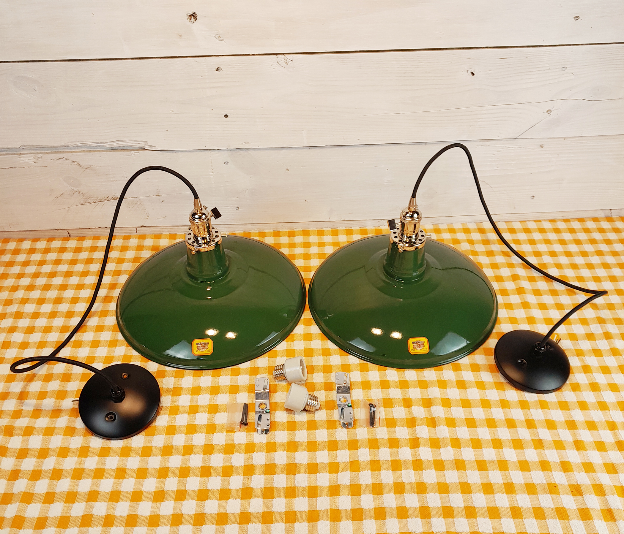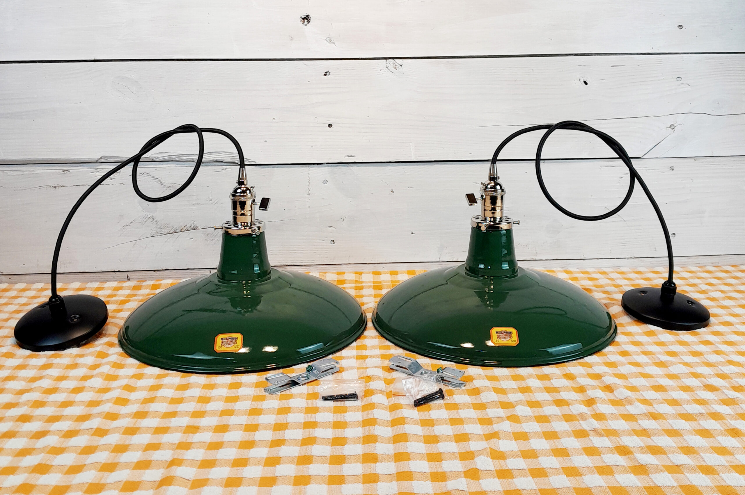 Hand-salvaged from a 1940s demolition lot, these are New Old Stock (NOS) Benjamin shallow pan shades with long neck. This means they have never been previously assembled or used, resulting in a “time capsule” finish. Unlike modern reproductions, these are genuine heavy-gauge steel with a fired-on green porcelain enamel, which means the color will never fade and the surface is resistant to heat and chemicals.