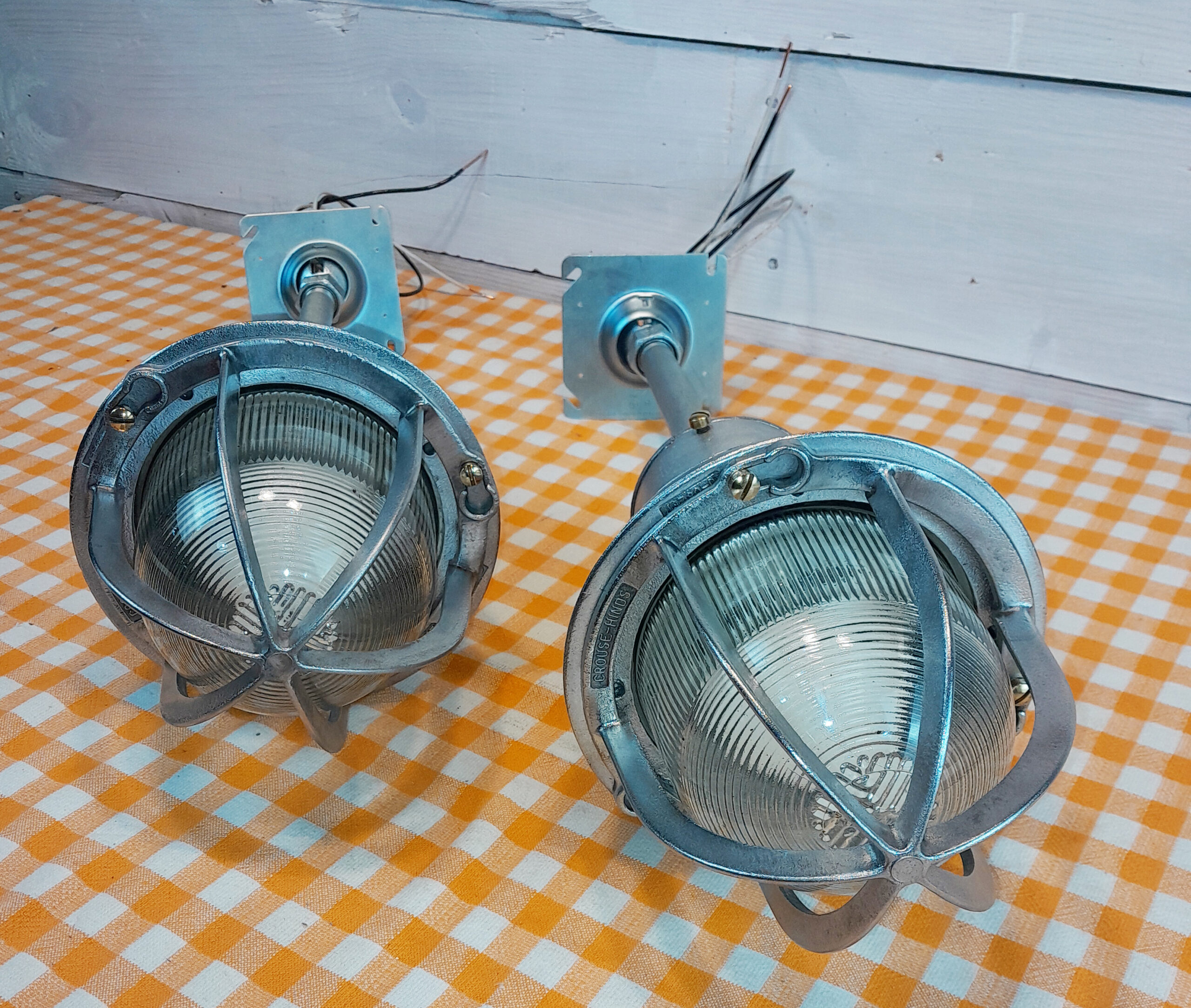𝗧𝗵𝗶𝘀 𝗽𝗮𝗶𝗿 𝗼𝗳 𝗮𝘂𝘁𝗵𝗲𝗻𝘁𝗶𝗰 Crouse-Hinds Explosion-Proof Pendant Lights (Model EVA-140) features a heavy-duty cast aluminum body and the iconic fluted glass globe protected by an aluminum cage. Originally engineered for hazardous environments, these fixtures are now prized for their “over-built” quality, which means they offer a level of industrial grit that modern reproductions simply cannot match.