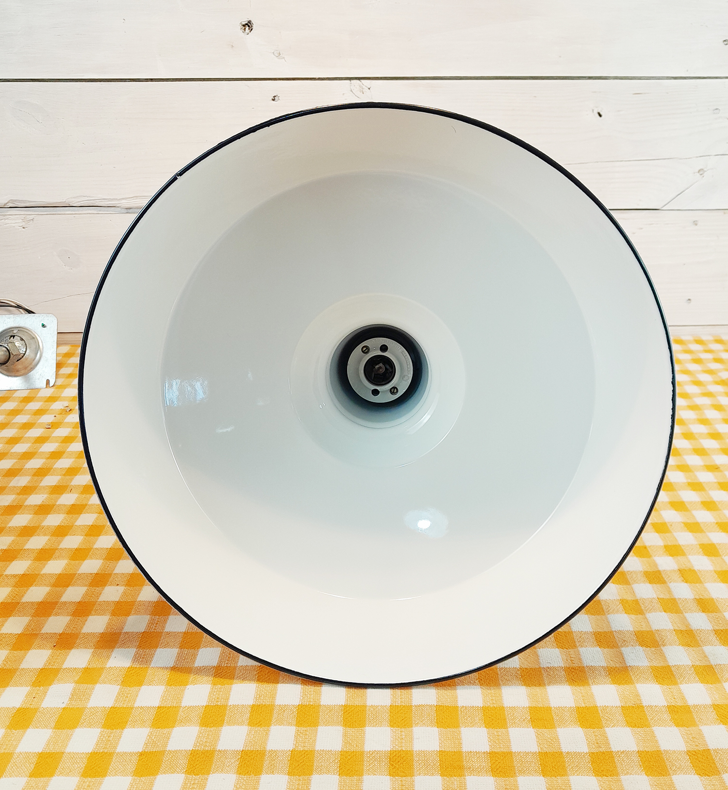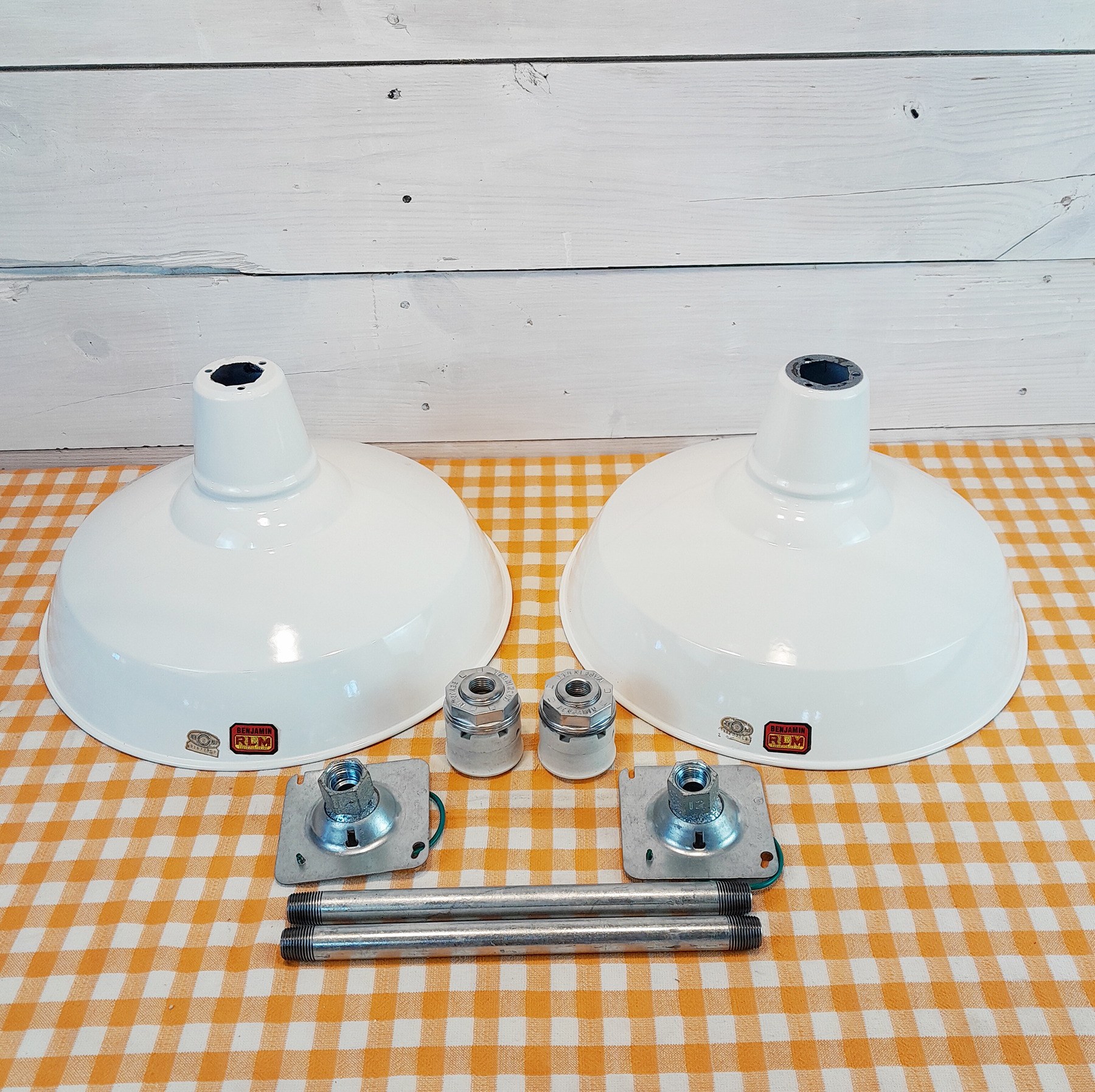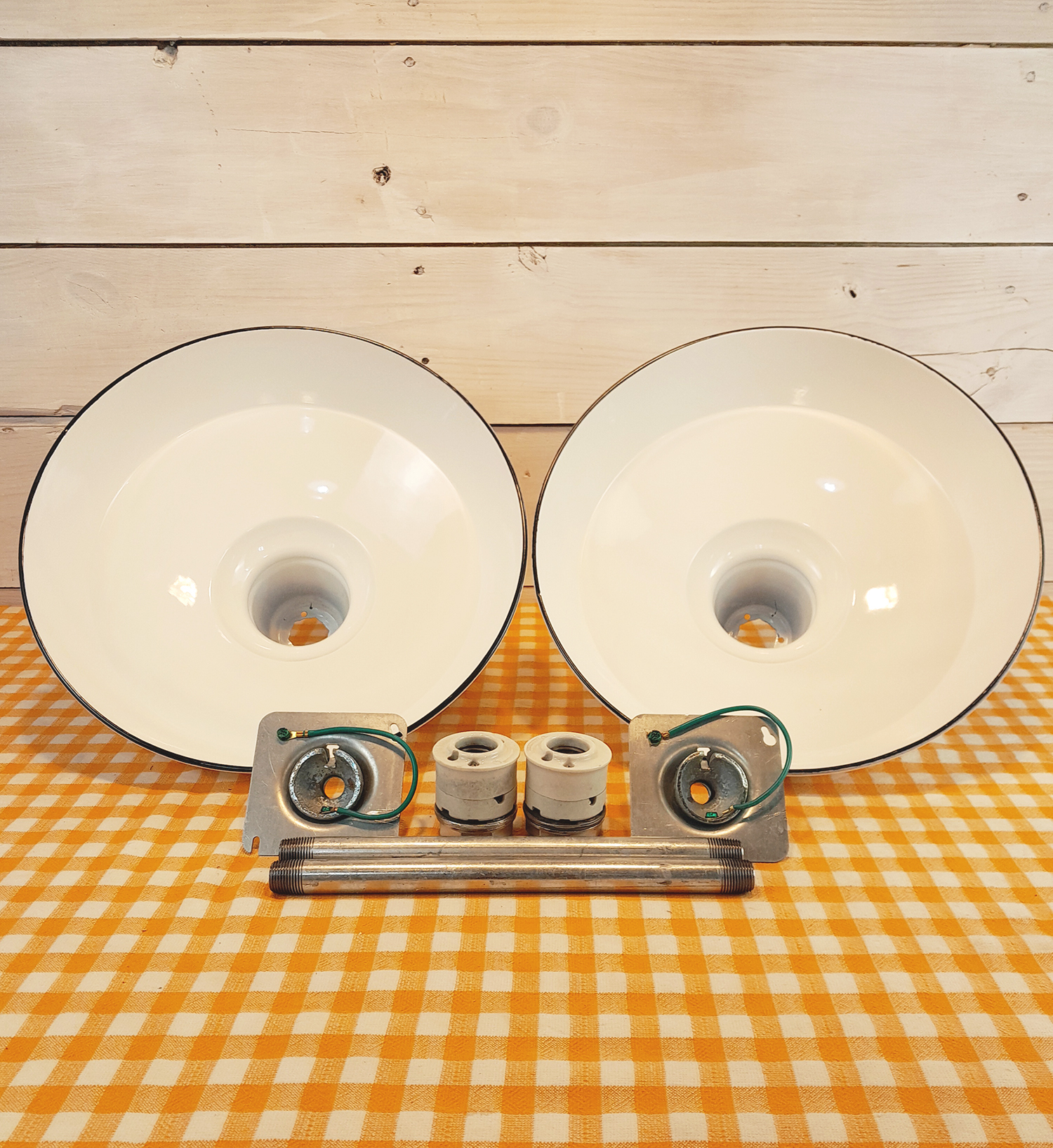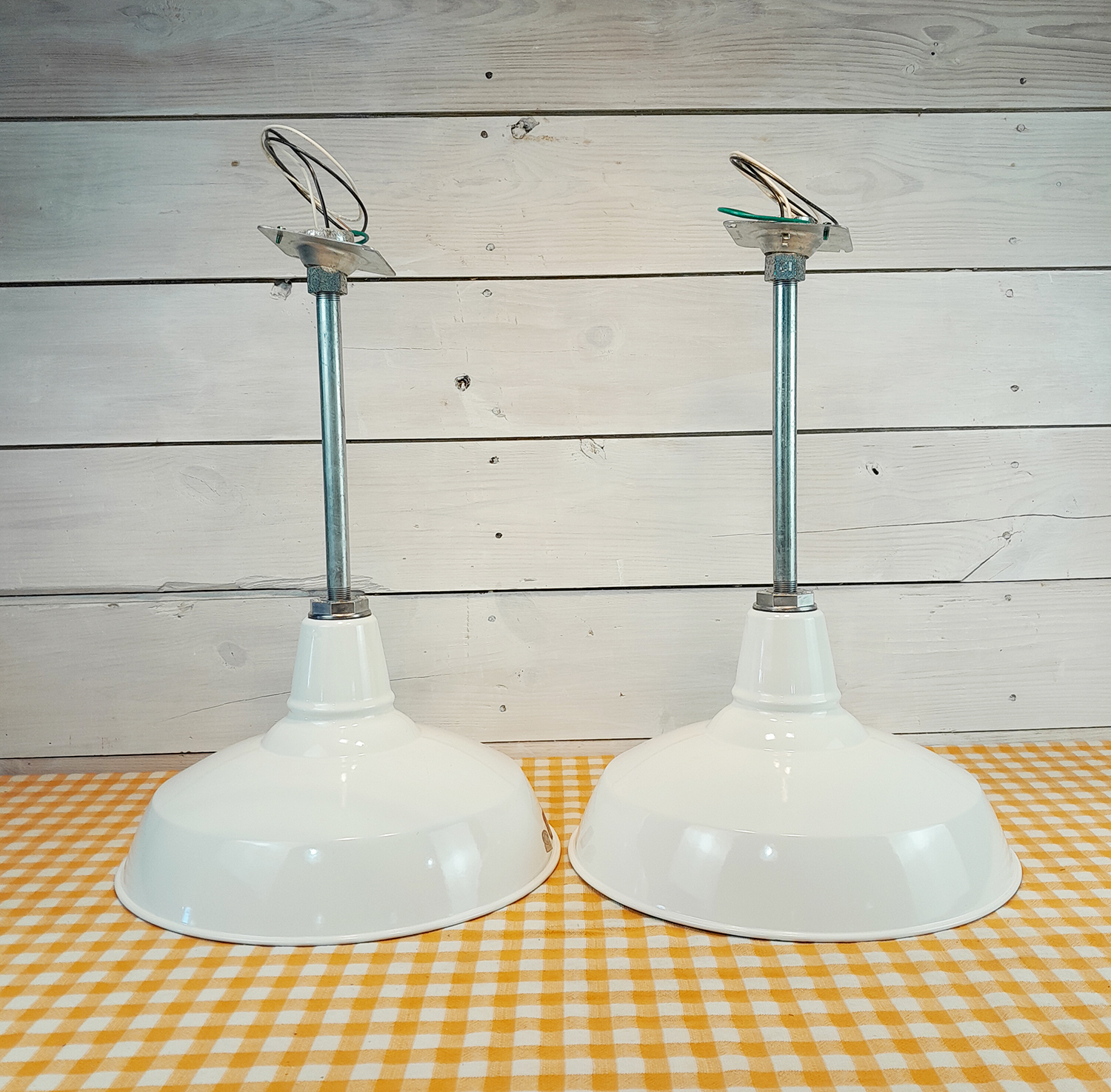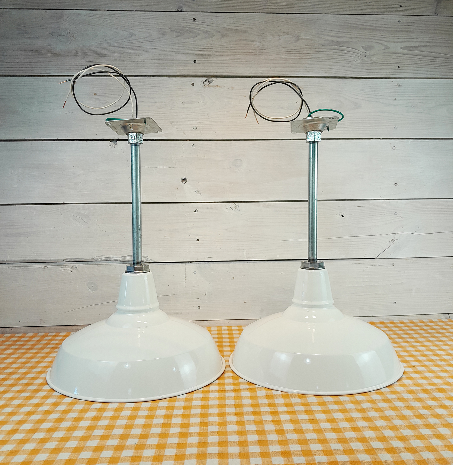 (2) Vintage 16″ White Porcelain Farm Lights: 1940s Industrial Gas Station Light