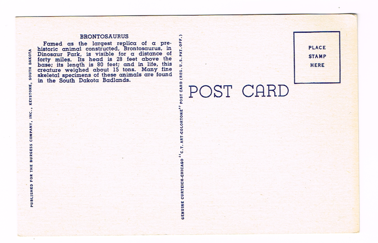 Vintage 1940’s “Brontosauras” Rapid City, S.D. Linen Postcard